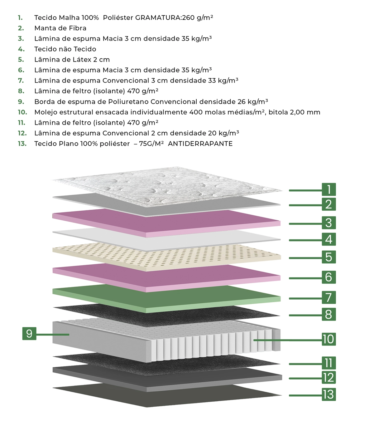 Seu design exclusivo apresenta três camadas de conforto: uma base niveladora com densidade 45, um conjunto de molas no tampo e camada de látex, proporcionando uma experiência de repouso incomparável. Os pés em madeira o completam, trazendo um toque de elegância e natureza ao seu refúgio de descanso.